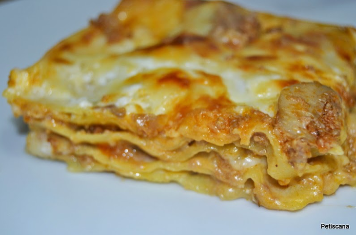 - Pincelar o fundo da travessa com molho bechamel, dispor as folhas de lasanha de forma a cobrir a travessa, por cima colocar a bolonhesa, regar com um pouco de natas e bechamel. Cobrir com um pouco de queijo ralado.