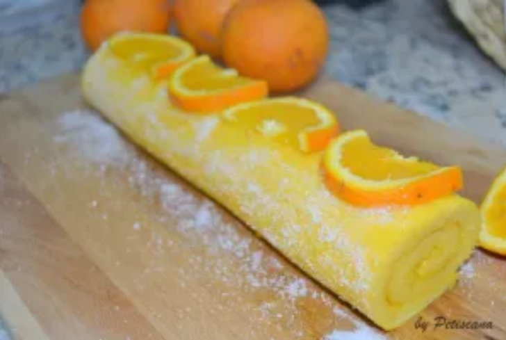 - Enrolar a torta, polvilhar com açúcar e decorar com rodelas de laranja a gosto.