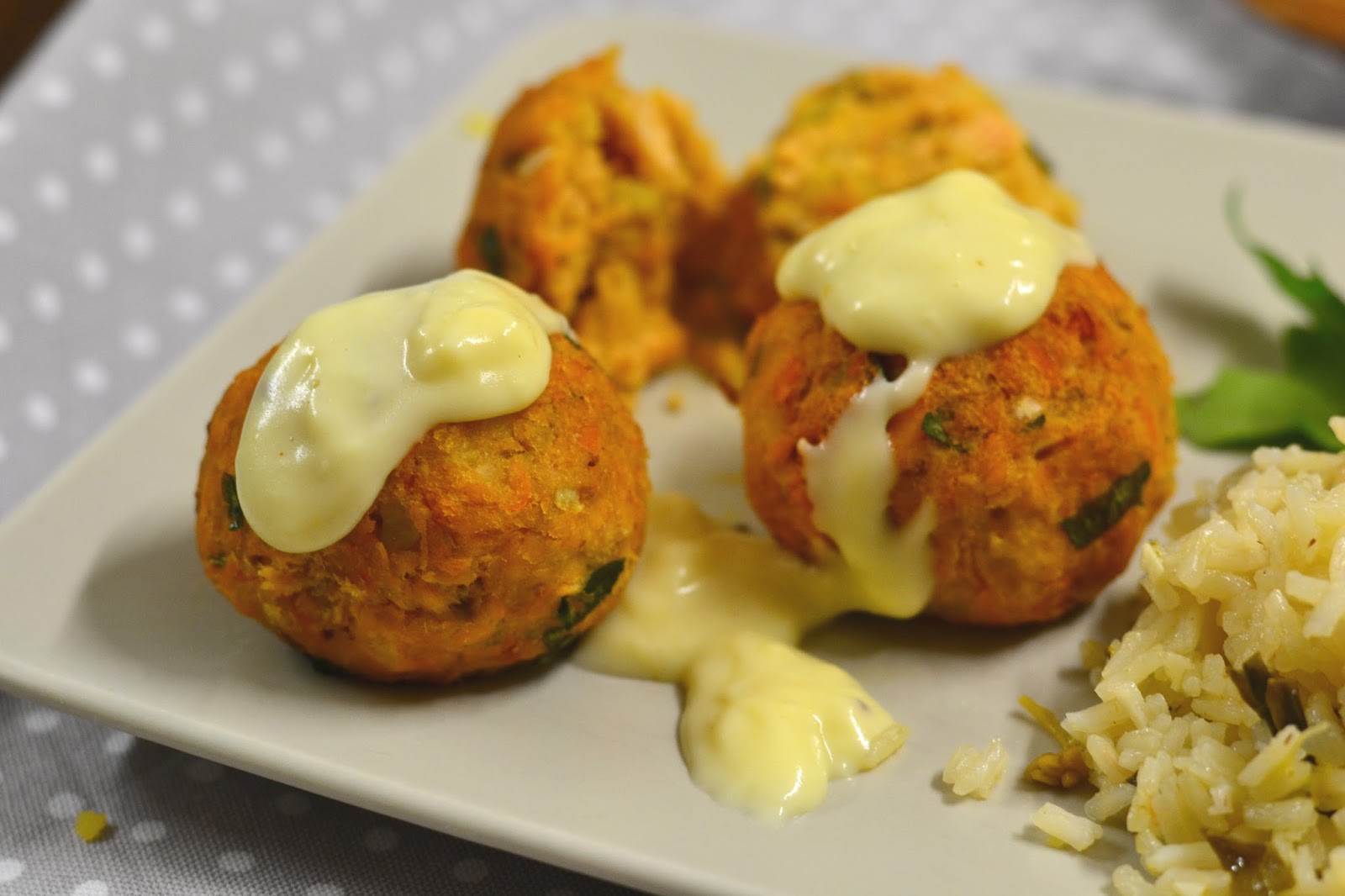 - Servir os bolinhos de salmão regados com o molho de béchamel.