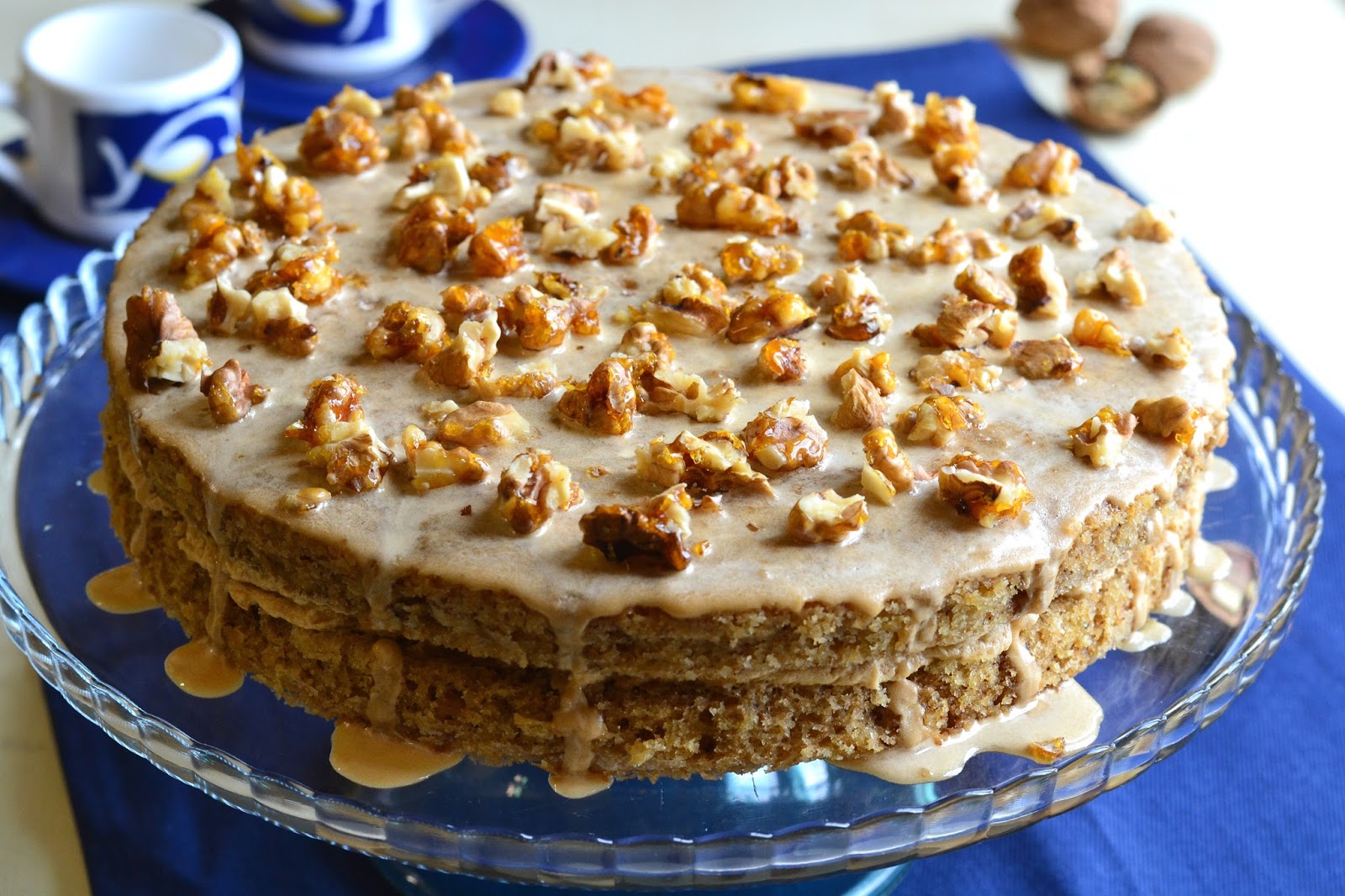 - Decorar o bolo com as nozes, se as quiser ligeiramente caramelizadas, derreter 1 c.sopa generosa de açúcar numa frigideira anti-aderente até ao ponto de caramelo, envolver as nozes e deixá-las arrefecer por completo sobre uma folha de papel vegetal antes de as colocar sobre o bolo.