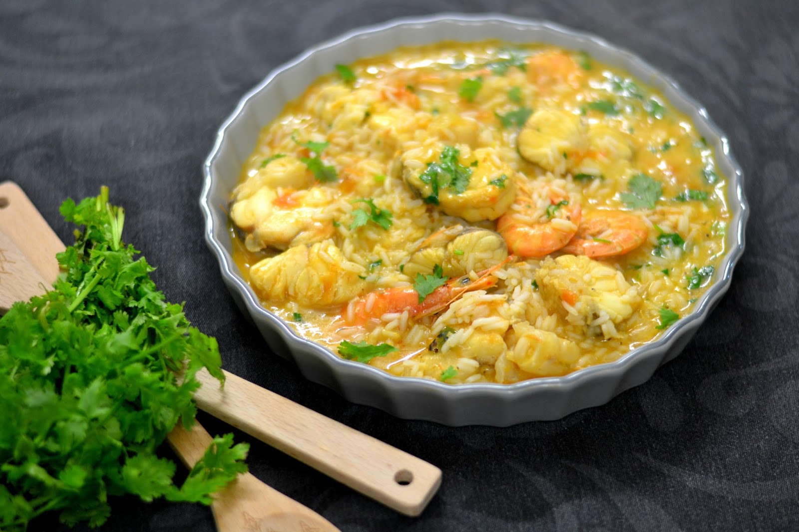 3) Adicionar o peixe, previamente temperado, os camarões e deixar cozinhar juntando água, pouco a pouco, consoante seja necessário, cerca de 15 minutos em lume médio. Quando o peixe e o camarão estiverem cozinhados, retirá-lo para uma travessa, e no tacho juntar as 5 chávenas de água, sal e pimenta a gosto e deixar ferver. Nesse momento adicionar o arroz, e cozinhar por cerca de 15 minutos. Pouco antes do arroz estar cozinhado, voltar ao tacho o peixe e os camarões, envolvendo bem. Polvilhar com coentros picados a gosto e servir de imediato.
