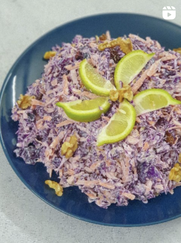 Rala a cenoura, a couve e a maçã, se tiveres mandolina, podes usar também. Lava tudo muito bem e escorre, mistura tudo com as nozes, sultanas e maionese e guarda no frigorífico até ao momento de servir!