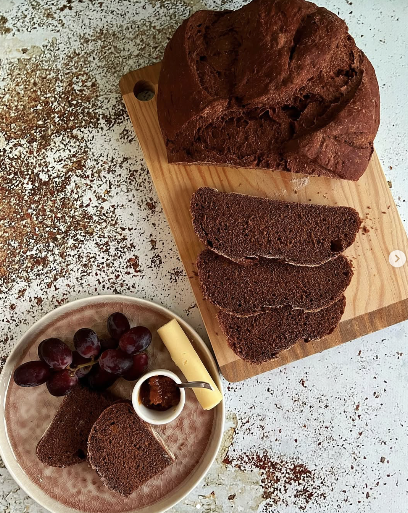 A receita base é a que costumo usar quando quero “inventar” com pães e não costuma me deixar mal! Não é um pão doce, é sim um pão rico em sabor, o cacau dá-lhe aquele sabor intenso que resulta bem servido tanto com compotas como com queijo.