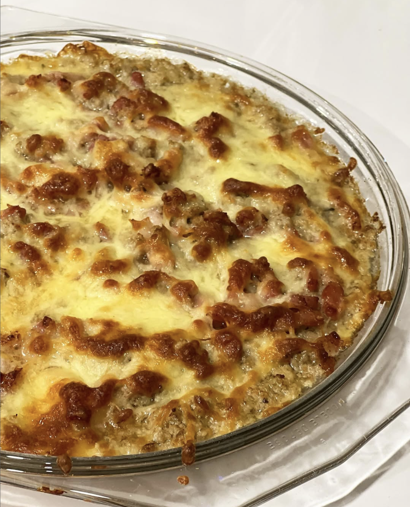 Junta de seguida a carne picada, a mostarda, o sal, a pimenta e os orégãos e salteia até que a carne fique toda no mesmo tom. Adiciona 50 g de natas e cozina alguns minutos.Deita tudo num pirex cobre com o queijo ralado e natas reservada e leva ao forno a 200°C cerca de 30 minutos ou até gratinar.